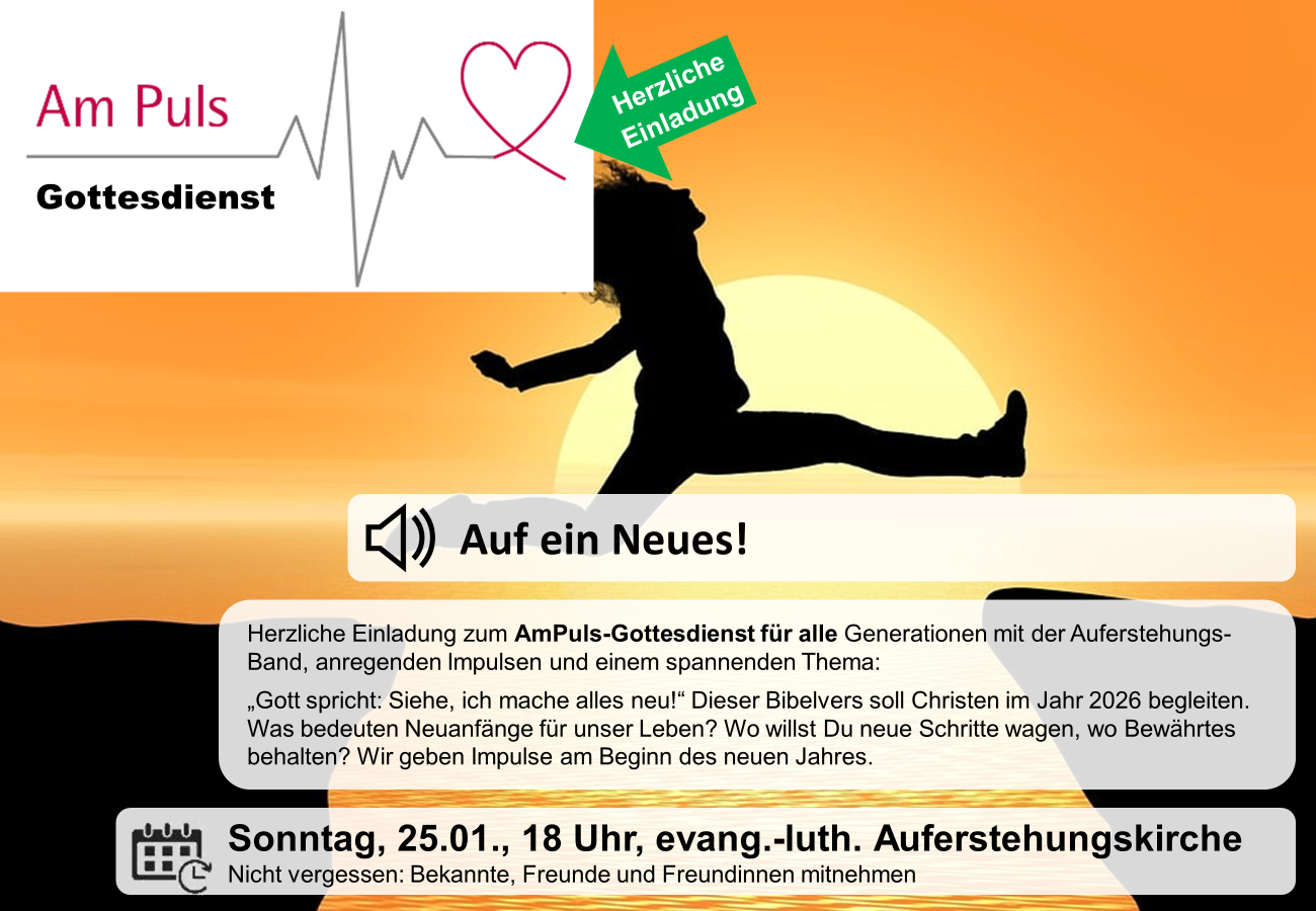 Herzliche Einladung zum AmPuls-Gottesdienst - dem entspannten Abendgottesdienst für alle Generationen mit der Auferstehungs-Band und lebensnahen Impulsen. Zum Beginn des neuen Jahres beschäftigen wir uns mit Neuanfängen, im Großen wie im Kleinen. Los geht´s um 18:00 Uhr in der Auferstehungskirche. Bringt gerne Freundinnen und Freunde mit. Wir freuen uns auf Euch!