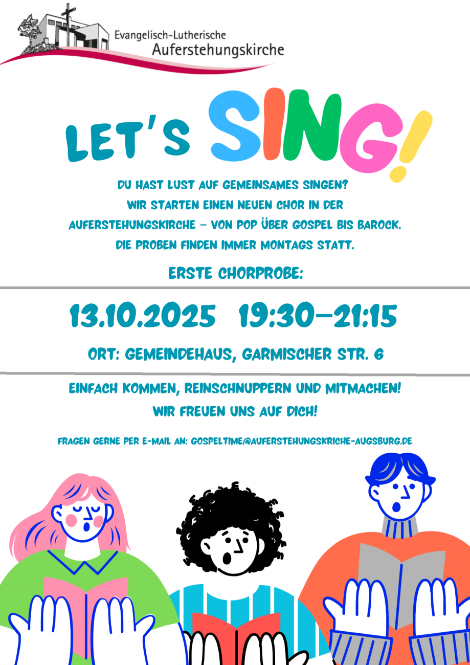 Lust, gemeinsam zu singen? Freude an Musik? Dann haben wir was Neues: Ab Oktober starten wir einen neuen Chor bei uns in Auferstehung. Mitmachen kann jede und jeder - das Programm ist ganz vielfältig, von Pop über Gospel bis Barock. Die Proben finden immer montags statt, Start ist am 13.10. von 19:30 bis 21:15 Uhr im Gemeindehaus, Garmischer Str. 6. Bei Interesse: Einfach kommen, reinschnuppern und mitmachen. Wir freuen uns auf Dich!