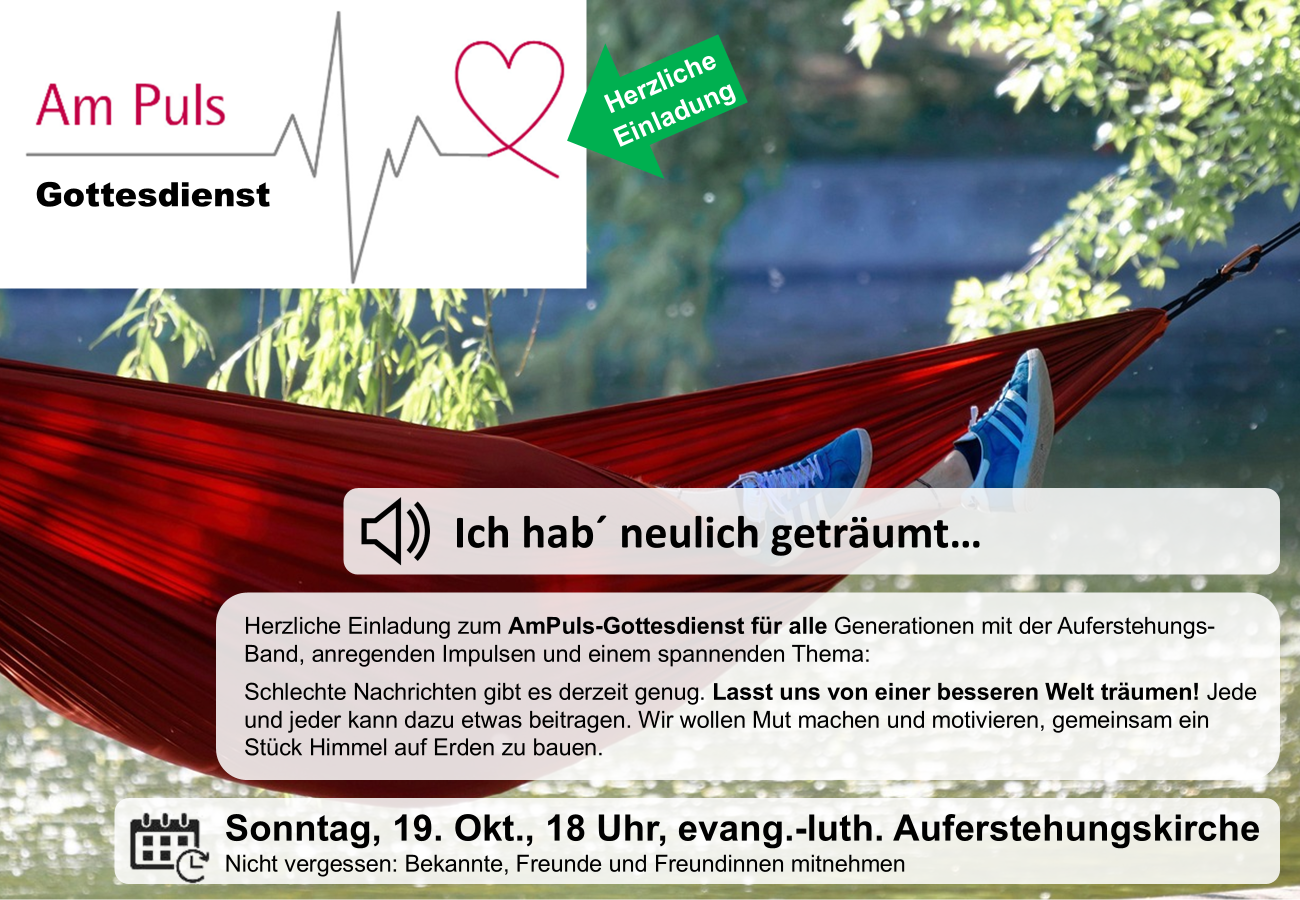 Herzliche Einladung an alle Generationen zum AmPuls-Gottesdienst am 19. Oktober um 18:00 in der Auferstehungskirche! Kommt zu diesem entspannten Abendgottesdienst mit modernen Liedern, unserer Auferstehungs-Band und einem motivierenden Thema: Schlechte Nachrichten gibt es derzeit genug. Wir wollen von einer besseren Welt träumen und schauen, was wir konkret beitragen können. Wir freuen uns auf Euer Kommen!